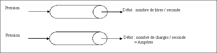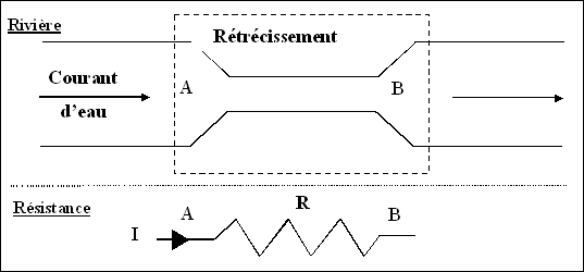 Par analogie, le débit du courant électrique (débit d’électrons) est limité par la résistance. Entre les points A et B se crée une différence de potentiel analogue à la différence de pression.