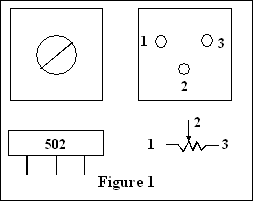 Le potentiomètre est composé d'une résistance fixe et d'un curseur se déplaçant sur cette dernière. La figure 1 vous présente une vue de côté, du dessus et du dessous d'un potentiomètre du même type (PC MOUNT). Le quatrième élément de cette figure représente le symbole graphique du potentiomètre. On y voit clairement que l'accès à la résistance fixe se fait par les bornes 1 et 3 tandis que l'accès au curseur est assuré par la borne 2.