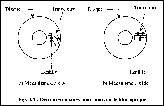 On compte principalement deux types de mouvements du bloc optique. Certains lecteurs utilisent le mécanisme "arc" qui fait déplacer le bloc optique en arc en allant du centre vers l'extérieur. D'autres utilisent le mécanisme "slide" qui fait déplacer le laser en douceur le long d'une tige métallique entre le centre et l'extérieur en des allers-retours. C'est ce dernier mouvement qui est utilisé dans la majorité des lecteurs de disques compacts actuellement sur le marché.