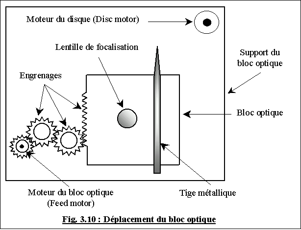 § Déplacement du bloc optique : le bloc optique se déplace sur une tige métallique à l'aide du « Feed Motor ». Il est très important de remarquer les engrenages qui déplacent le bloc optique. Ils sont disposés de façon à ce que le moteur « Feed Motor » puisse tourner dans un sens et dans l'autre et bouger le bloc optique au minimum.