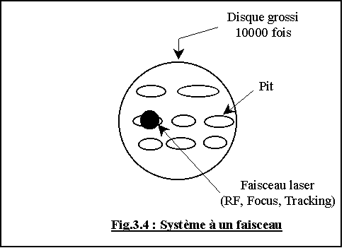 Les deux figures suivantes montrent les deux types de rayon laser. Le premier schéma représente un rayon laser à un faisceau, utilisé pour la lecture des informations sur le disque ainsi que pour la focalisation (focus) et le suivi de piste (tracking). Le deuxième schéma illustre un rayon laser à trois faisceaux : 1 primaire utilisé pour la lecture et la focalisation et deux secondaires de part et d'autre du primaire, servant au tracking.