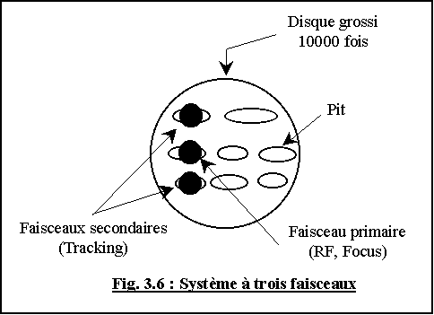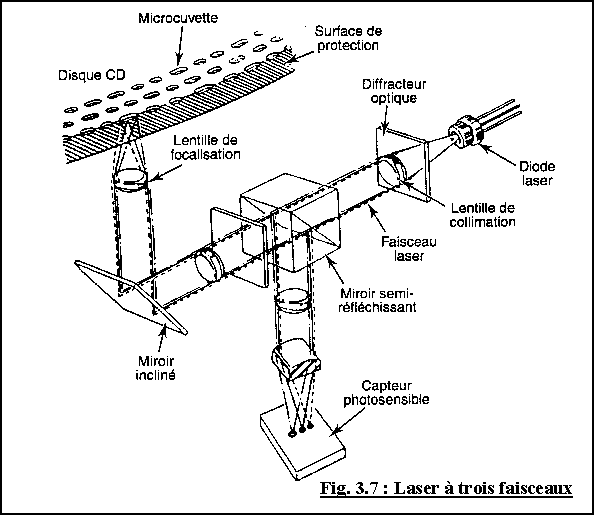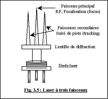 Le rayon laser sort de la diode, passe à travers une lentille séparatrice (lentille de diffraction qui divise le faisceau en trois. Le faisceau principal (celui du centre) sert à faire la lecture des données et les deux faisceaux secondaires servent à faire le pistage (tracking).
