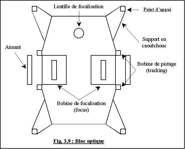 § Déplacement des lentilles de focalisation : les bobines « tracking coil » et « focus coil », à l'aide d'aimants fixes, servent à l'ajustement du focalisation et du pistage. Un circuit extérieur envoie une tension continue (D.C.) aux bobines qui se déplacent : verticalement dans le cas de « focus coil » et horizontalement dans le cas du « tracking coil ». Le support en caoutchouc sert de suspension pour le bloc contenant la lentille de focalisation.