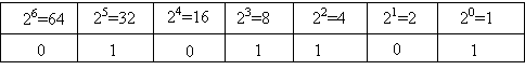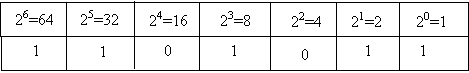 11010112 = 1 x 64 + 1 x 32 + 0 x 16 + 1 x 8 + 0 x 4 + 1 x 2 + 1 x 1 = 64 +32 + 8 + 2 + 1 11010112= 10710