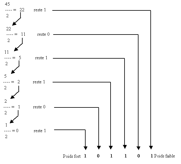 Première méthode : soit à convertir le nombre décimal 45 en binaire