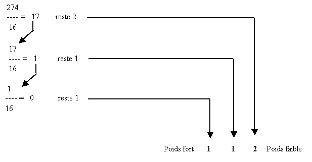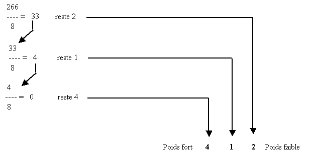 Exemple 1 : 3728 = (3 x 82) + ( 7 x 81) + (2 x 80) = 3x 64 + 7 x 8 + 2 x 1 = 25010