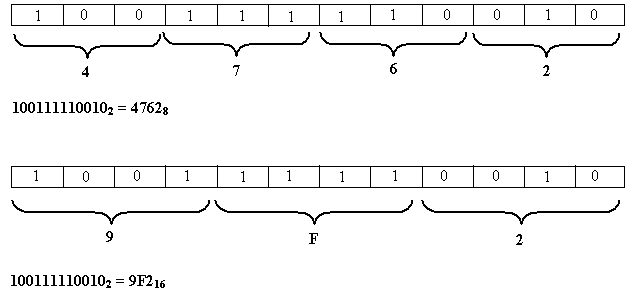 5.9. Conversion binaire-octal et binaire-hexadécimal : à partir de la gauche, on décompose le nombre binaire en tranches de trois bits pour passer à l’octal et en tranches de 4 bits pour passer à l’hexadécimal puis on attribue à chacun des groupes le chiffre octal ou hexadécimal correspondant.