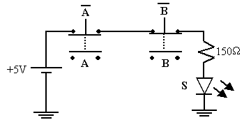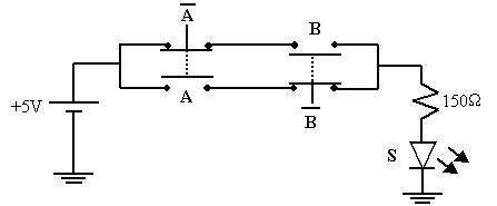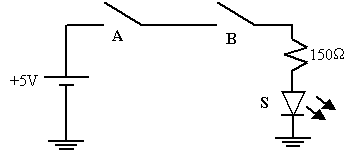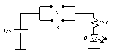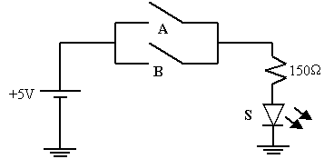 On sait que la LED va s’allumer lorsque la tension à son anode sera positive par rapport à la tension à sa cathode. Ceci se produira si l’on ferme l’interrupteur A, l’interrupteur B ou les deux à la fois. La LED est éteinte si et seulement si les deux interrupteurs sont ouverts.