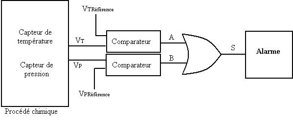 Application : système de régulation industriel (application d’une porte « OU » à un système d’alarme). Le déclenchement de l’alarme se fera si la température ou la pression d’un procédé chimique excède une valeur maximale.
