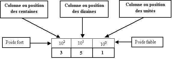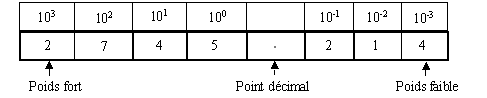 Le même principe s’applique pour les nombres décimaux. Après le point décimal, le poids des colonnes est successivement 10-1= 0.1, 10-2= 0.01, 10-3 = 0.001 etc.
