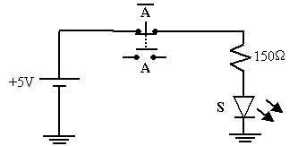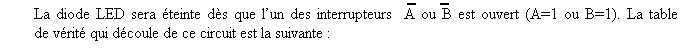 Si A est ouvert, « NON A » qui est un interrupteur normalement fermé est égal à 1, la LED est allumée alors que si A est fermé, « NON A » est égal à 0 et la LED est éteinte.