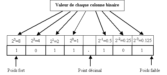 5.1. Conversion binaire-décimal : tout nombre binaire peut être transformé en son équivalent décimal simplement en additionnant les poids des diverses positions où se trouve une valeur « 1 ».
