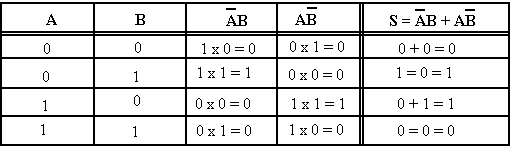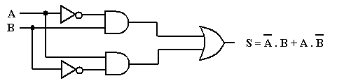 La sortie du « OU Exclusif est au niveau haut (1) seulement quand les deux entrées sont à des niveaux différents comme le montrent le schéma équivalent et la table de vérité suivants :