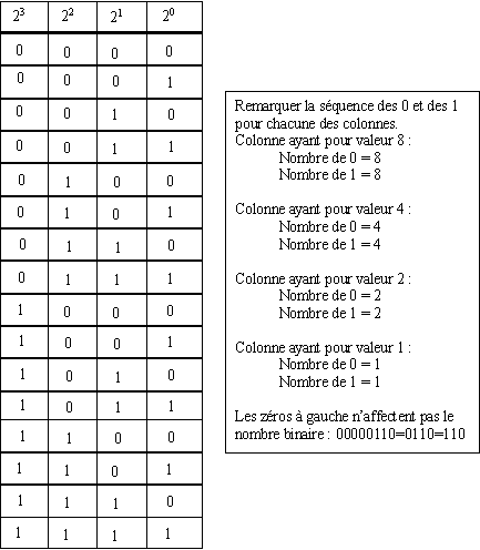 Comptage binaire : avec 4 bits, on peut compter de 0 à 15 (24 – 1 = 15)
