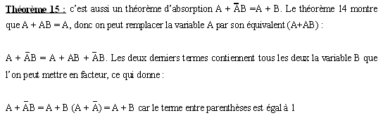 Théorème 14 : c’est un théorème d’absorption A + AB =A. En effet A + AB possède deux termes comprenant chacun la variable A que l’on peut mettre en facteur :