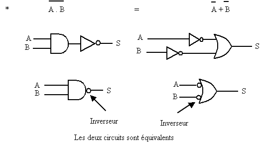 Les théorèmes de De Morgan permettent de couper une barre de complémentation à n’importe quel point d’une expression et de changer l’opérateur en ce point par l’autre (changer le signe (+) par le signe (.) et vice versa). Cette démarche est répétée jusqu’à ce que l’expression ne soit plus formée que de variables simples.