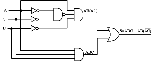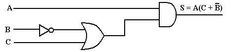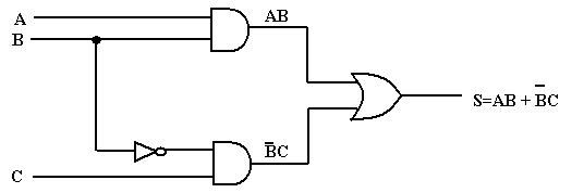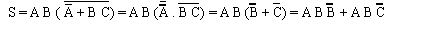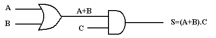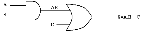 La sortie de la porte « ET » a pour expression A.B, cette combinaison est une entrée de la porte « OU » dont l’autre entrée est le signal C. Cette dernière a pour effet d’additionner logiquement ses entrées ce qui donne comme expression de sortie S = AB+C = C+AB.