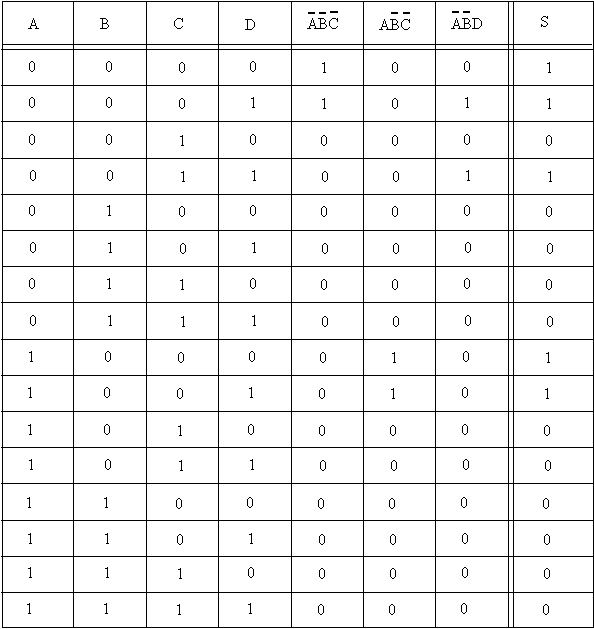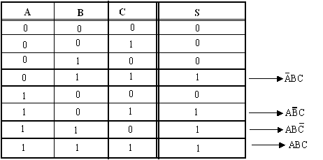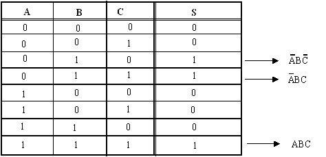 L’expression pour la sortie S découle de la table de vérité et se présente sous la forme de produits. Soit la table de vérité suivante :