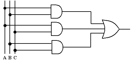 Noter la parenthèse pour dire que A et B sont d’abord additionnés logiquement avant que leur somme ne soit multipliée logiquement avec C.