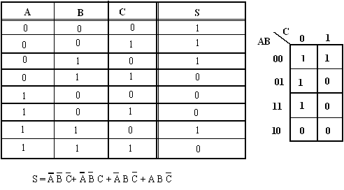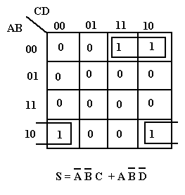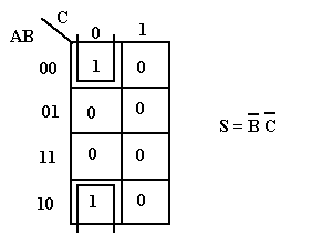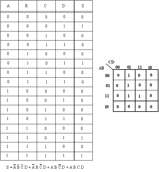 a) La table de vérité donne la valeur de S pour chacune des combinaisons des valeurs d’entrée ; par contre, le diagramme de Karnaugh organise l’information de manière différente. Chaque ligne de la table de vérité correspond à un carré du diagramme de Karnaugh.
