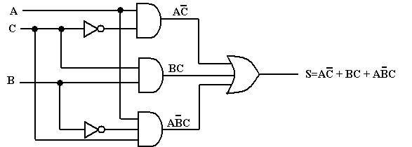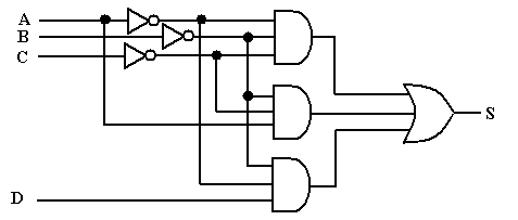 Dès que l’expression de la sortie est établie sous la forme d’une somme de produits à partir de la table de vérité, il est alors facile de construire le circuit au moyen de portes « ET », « OU » et « NON ».