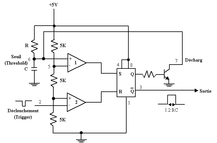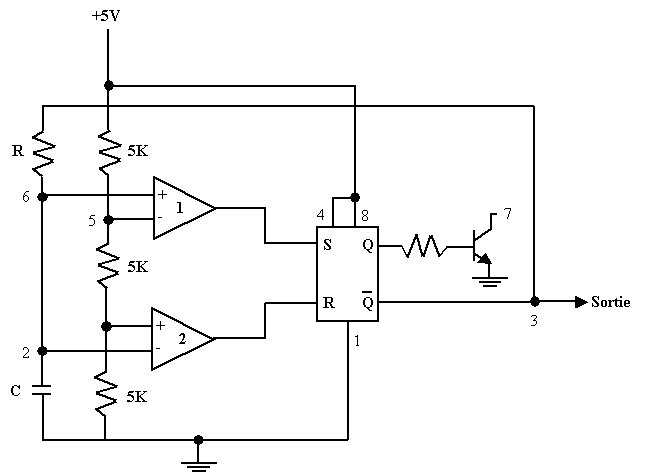 Lorsque Vc > 3.33 V alors S = 1 et Q = 1, (Non Q) = 0, le condensateur se décharge à travers de la résistance R.