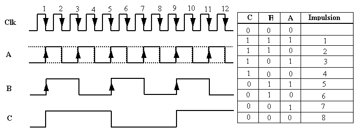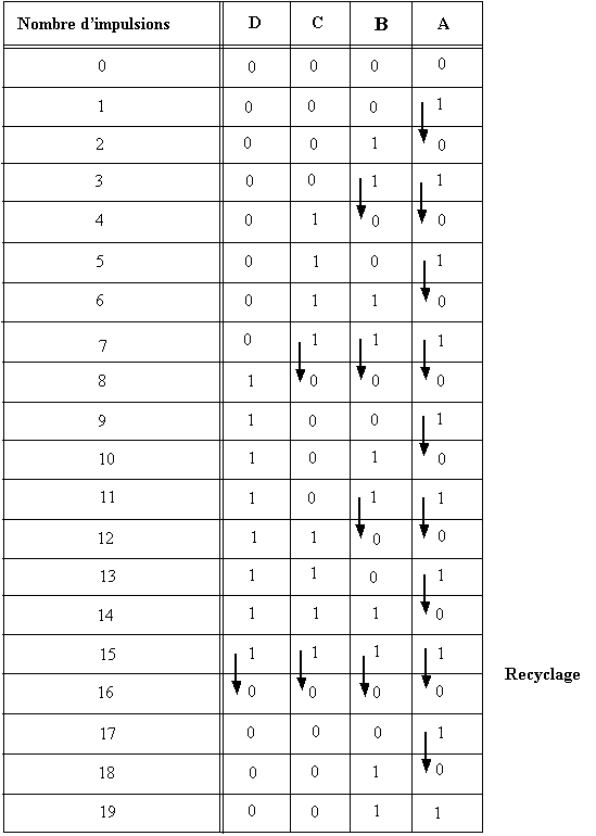 3. Tableau montrant la suite des états binaires pris par les bascules après chaque impulsion d’horloge;