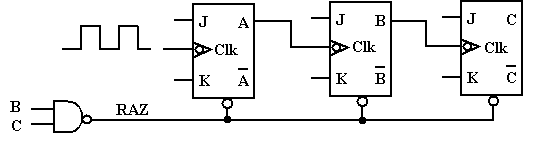 b. Les entrées de la porte Non-Et sont les sorties des bascules B et C de sorte que la sortie de cette porte passe à 0 lorsque B = C = 1.