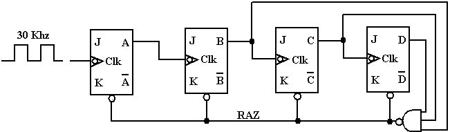 Quand la 16ème impulsion atteint la borne Clk de la bascule A, la sortie de la bascule A passe de 1 à 0, ce qui fait commuter la bascule B dont la sortie passe de 1 à 0 et ainsi de suite jusqu’à ce que le compteur affiche 0000.