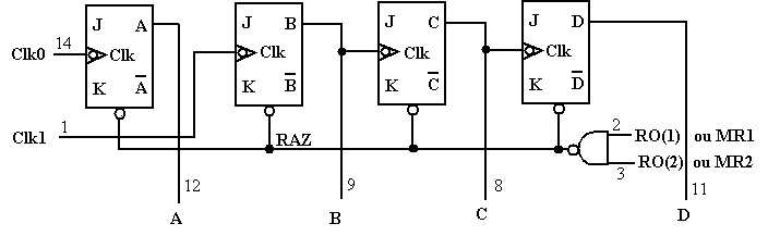 c. Chaque bascule possède une entrée asynchrone de remise à zéro. Ces entrées sont raccordées à la sortie d’une porte Non-Et à deux entrées RO(1) et RO(2) ou MR1, MR2 (Reset Out ou Master Reset).