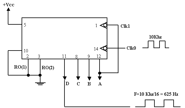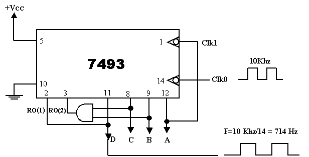 F d’entrée = 30 KHZ ö fréquence de sortie de D : 30KHZ / 14 = 2.14KHZ