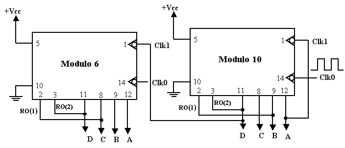 Exemple 3 : Réalisez un compteur modulo 60 en utilisant deux puces 7493 (modulo 10 et modulo 6).