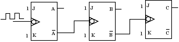 1. Les impulsions d’horloge sont appliquées à la borne Clk de la bascule A. Celle-ci commute (passe à l’état opposé) chaque fois qu’arrive un front descendant (transition niveau haut à niveau bas), J = K = 1;