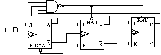 Si on ne tient pas compte de la porte Non-Et, c’est un compteur asynchrone modulo-8 qui affiche la suite des nombres de 000 à 111.
