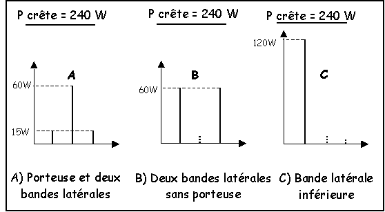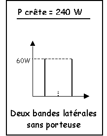 §           la modulation à double bande latérale DBL ou DSBSC (double side band suppressed carrier), dérivée de la modulation AM mais plus performante (gain en puissance);