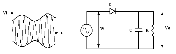 Lorsque les signaux sont de faible amplitude, il apparaît dans le signal détecté une distorsion car on se trouve dans le coude de la caractéristique de la diode. Ceci est d’autant plus vrai lorsque le taux de modulation est élevé.