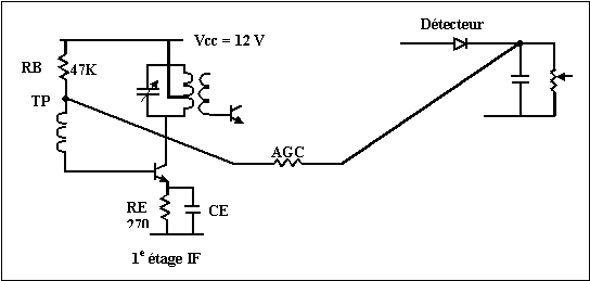 Pour éviter les pertes de puissance importantes, au lieu de faire varier le courant émetteur directement, on préfère appliquer la tension de commande à la base du transistor du 1e étage IF. Les variations dans le courant "base émetteur" sont alors amplifiées.