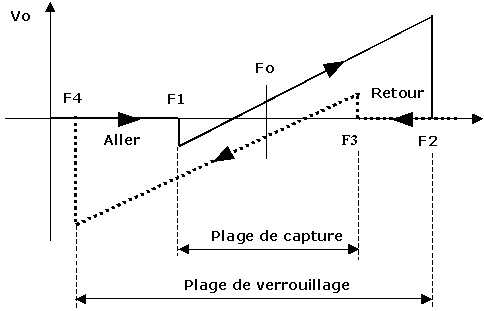 Pour la courbe "aller" la fréquence augmente progressivement, la courbe ne répond au signal d’entrée que lorsque la fréquence est supérieure à la limite inférieure F1 correspondant à la limite inférieure de la plage de capture. La boucle se verrouille alors sur le signal d’entrée en créant une tension d’erreur négative. Puis la tension d’erreur varie avec la fréquence qui passe par Fo. La poursuite fonctionne jusqu’à ce que la fréquence atteigne F2 correspondant à la limite maximale de la plage de verrouillage. Le PLL est hors verrouillage et la tension d’erreur s’annule.