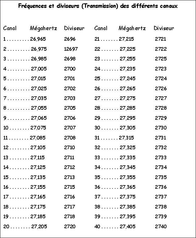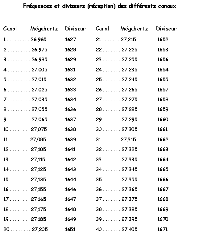 Les nombres N = 1627 à 1671 correspondent aux 40 canaux autorisés. 1627 correspond au canal 1, 1671 au canal 40, 1628 au canal 2 etc. (voir tableau correspondant ci-dessous).