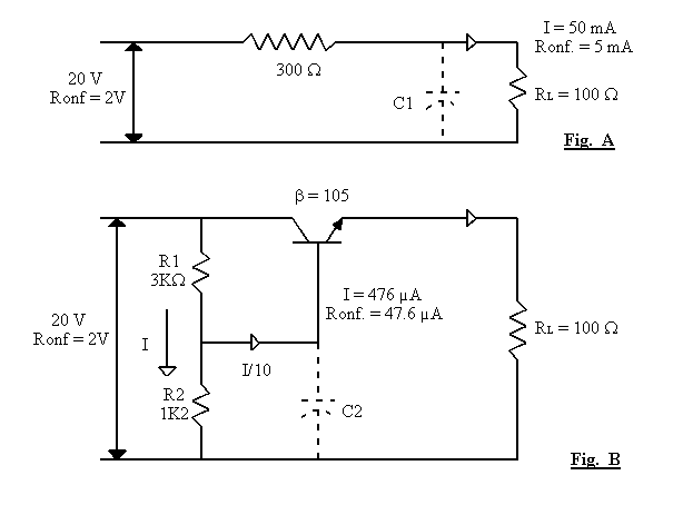 À la figure A, le condensateur C1 doit éliminer 5 mA de ronflement alors qu’à la figure B, le condensateur C2 n’aura à éliminer que 47.6 µA de ronflement soit 105 fois moins que C1.