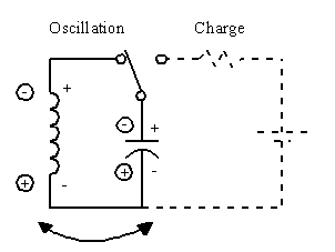Le plus simple des oscillateurs électroniques est le circuit résonant pur formé d’une inductance pure et d’un condensateur pur (sans résistance). Lorsque la capacité initialement chargée est reliée à l’inductance, l’énergie électrique se met à osciller entre la self et la capacité avec une fréquence égale à :