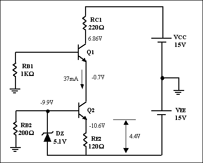La tension aux bornes de la résistance RE2 est : VRE2 = -10.6 –(-15) = 4.4 volts. Cette tension est fixe et stable. Le courant d’émetteur de Q2 est aussi stable et égal à : IE2 =4.4/120 =37mA