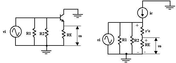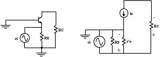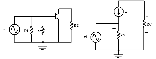 du transistor en AC, on obtient le schéma de droite de la figure ci-dessous.