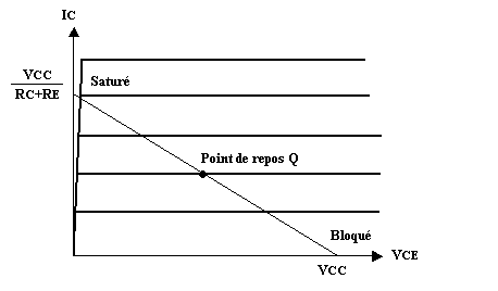 Pour faire fonctionner un amplificateur en classe A, on doit positionner le point de repos Q (Quiescent en anglais) au milieu de la droite de charge. Ceci signifie qu'au repos (sans application du signal) un courant IC permanent circule dans le transistor.