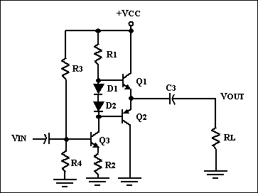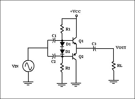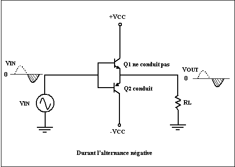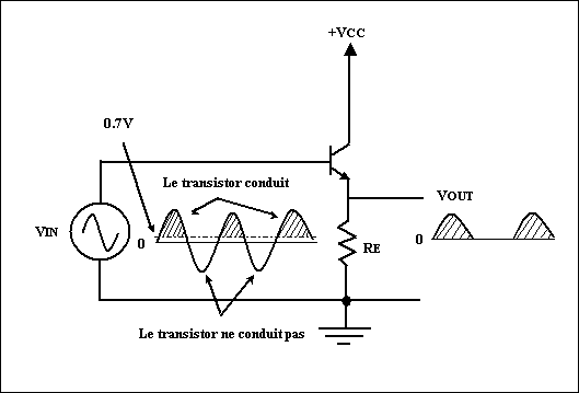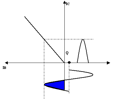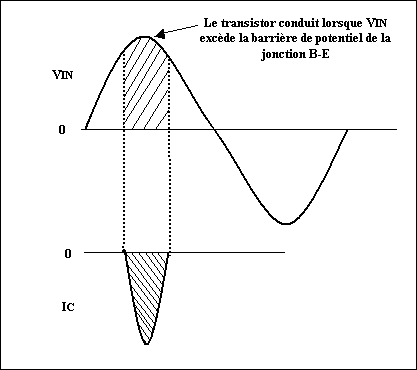 Ceci est réalisé par la classe B où l'on amène le transistor à fonctionner sans signal d'attaque juste au point de blocage (“cutoff”). Dès que l'alternance positive du signal d'attaque sera présente, le transistor se débloquera et conduira.