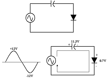 direct, le condensateur se charge à la valeur crête moins 0.7 volt soit