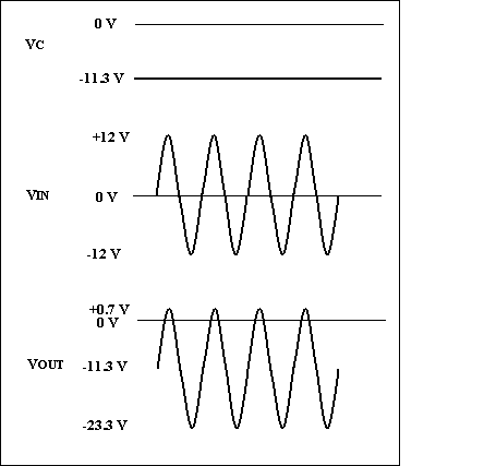 Pendant l’alternance négative, la diode est bloquée. À ses bornes, on a deux sources de tensions en série : la source alternative et le condensateur chargé à 11.3 volts.