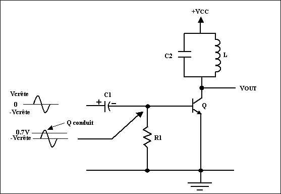 Dans le cas d’un amplificateur en classe C, la diode D est représentée par la jonction base-émetteur du transistor (voir figure suivante). Ce dernier ne conduira qu’un court instant sur les crêtes positives du signal qui se retrouve sur sa base. La jonction base-émetteur et le condensateur C permettent de verrouiller négativement le signal comme le montre la figure précédente.