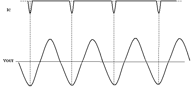 Cette polarisation, inférieure à ce qu'elle serait en classe A, permet au transistor de peu débiter sans signal. La linéarité naturellement en souffre mais nous chargerons l’amplificateur par un circuit de sortie qui aura, entres autres, la fonction de filtrer les harmoniques produits par ces non-linéarités.