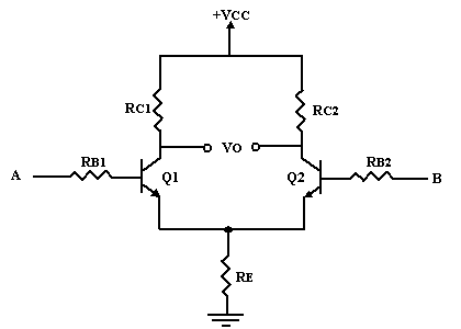 Tout amplificateur opérationnel que l'on notera AOP repose sur un circuit appelé amplificateur différentiel. Cet amplificateur a la particularité d'amplifier la différence des tensions appliquées sur les entrées A et B. On récupère le signal de sortie entre les deux collecteurs.